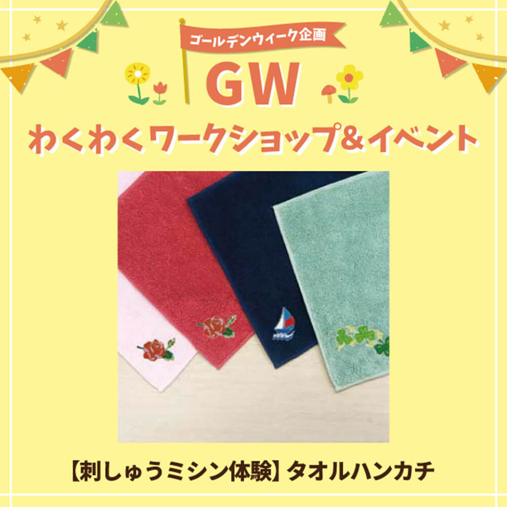 5/2(土):刺しゅうミシン体験 タオルハンカチ (税込500円 予約不要)①11:00~13:00 ②14:00~17:00