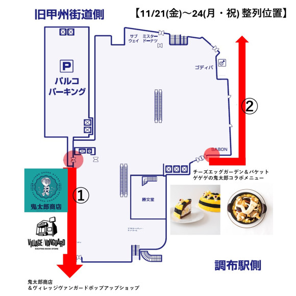 上記2つのメニューをお求めのお客様は、当日9:50までに調布PARCO 1F・正面入口向かって右側(サボン側)にお並びください。(画像1枚目・右側赤矢印位置)