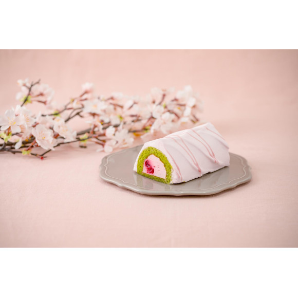 レアチーズケーキを抹茶の米粉生地で包み込み、サワーチェリーのシロップ入りクリームと桜のガナッシュソースで淡い桜色の装いに仕上げました。