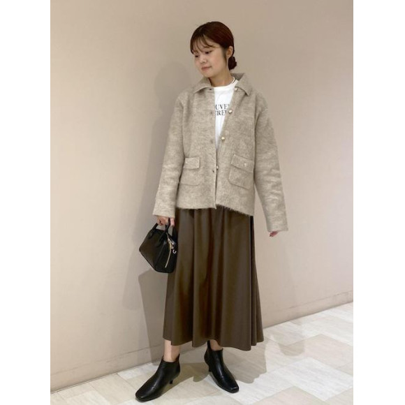 カーディガンは起毛、スカートはレザーと異素材を合わせてバランスを取りました。