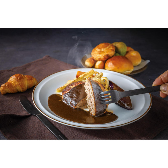 旨みあふれるハンバーグに黒ごまの香ばしさを効かせた濃厚ブラックデミソースを合わせました。