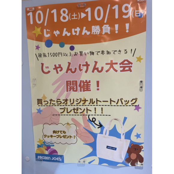 ルール・フローズンジョーズ従業員とじゃんけんをしていただき、勝ったらオリジナルトートバッグ、負けたらクッキータイムのクッキーをプレゼントです!