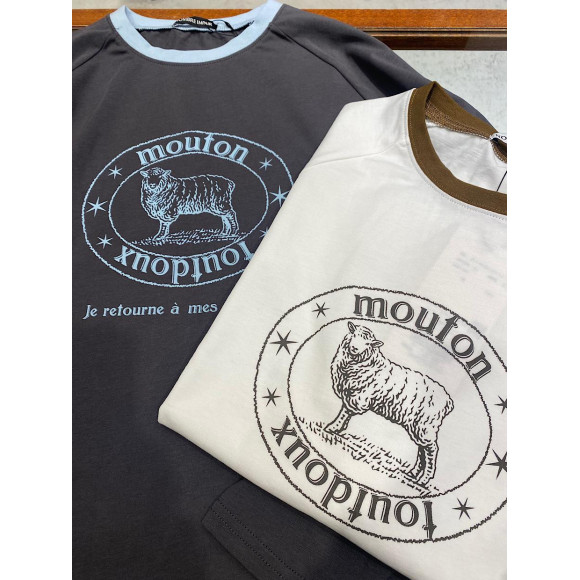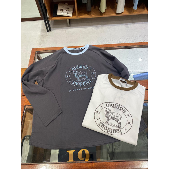 衿元を配色にした羊柄プリントのラグランプルオーバー。