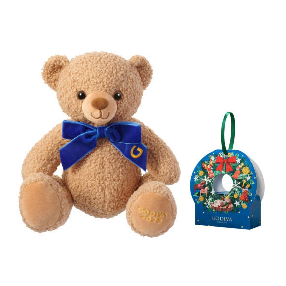 ネイビーのリボンを身に着けた、シックな装いのホリデーシーズン限定ベア。2種類のG キューブがアソートされたG キューブオーナメント 2粒入とのセットです。