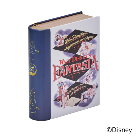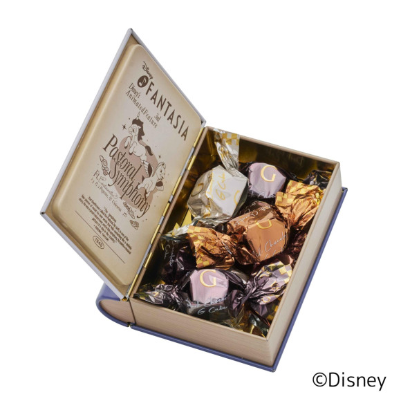 ミッキーと『ファンタジア』に登場する可愛いらしいキューピッドやユニコーンたちが集うポスターアートを配して、古い洋書をイメージしたブック形の缶に、ミルク、ダーク、ホワイトチョコレートプラリネのG キューブを合計8粒詰め合わせました。ちょっとしたおみやげや、ご自分用にぴったりです。