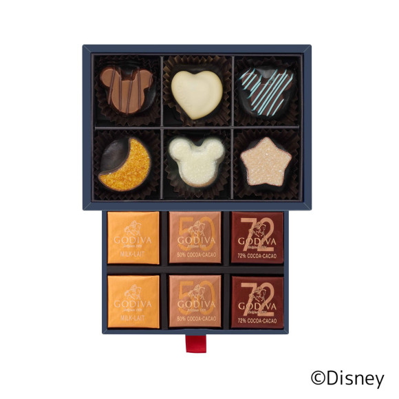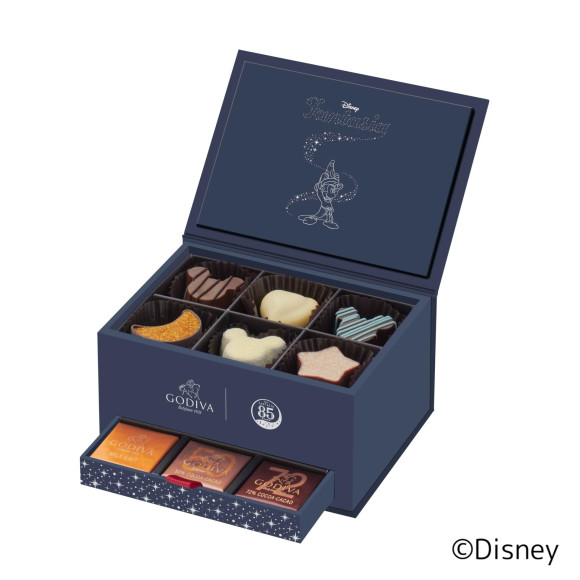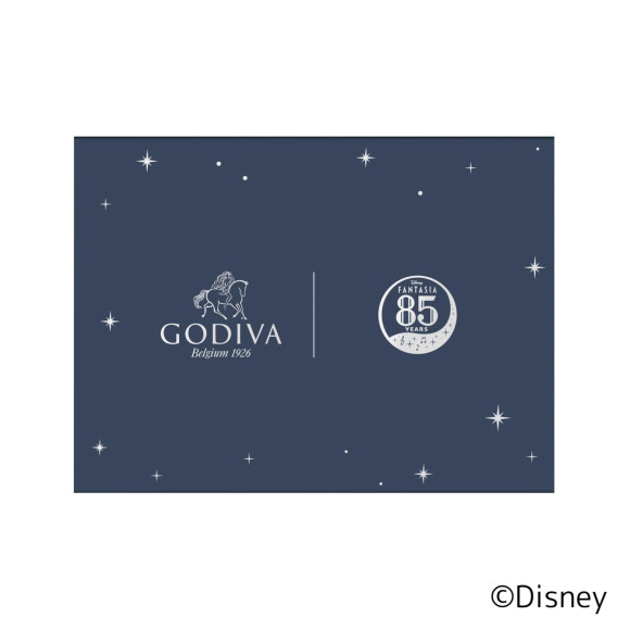 「ゴディバ『ファンタジア』コレクション」は “Wish your happiness”をテーマに、ミッキーマウスの魔法によって導かれるキラキラと輝く幻想的な『ファンタジア』の世界観をイメージしたコレクションです。 『ファンタジア』の1シーンをデザインしたスペシャルなギフトボックスに、ミッキーアイコンをかたどった3種類の限定チョコレートと、星や月の形のチョコレート、カレなどを贅沢に詰め合わせました。