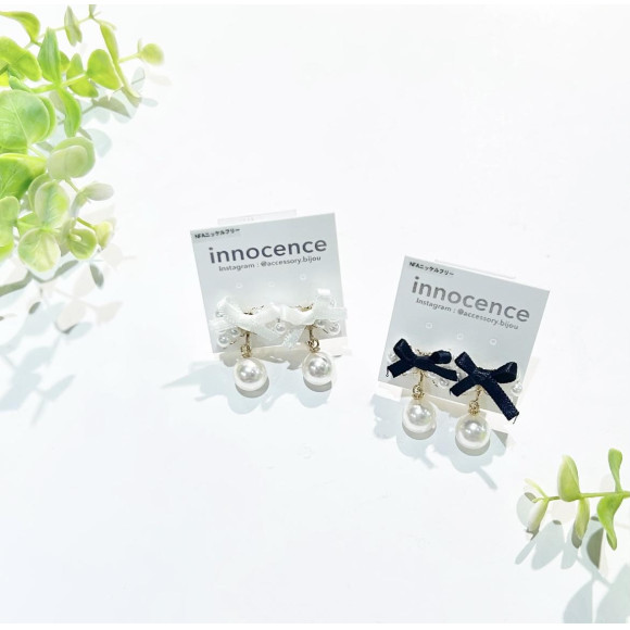 小さめのリボンにパールが可愛いイヤリングです♡ リボンの後ろに小粒のパールとぶら下がるパールがついており付けるとパッと明るく華やかになります✨️