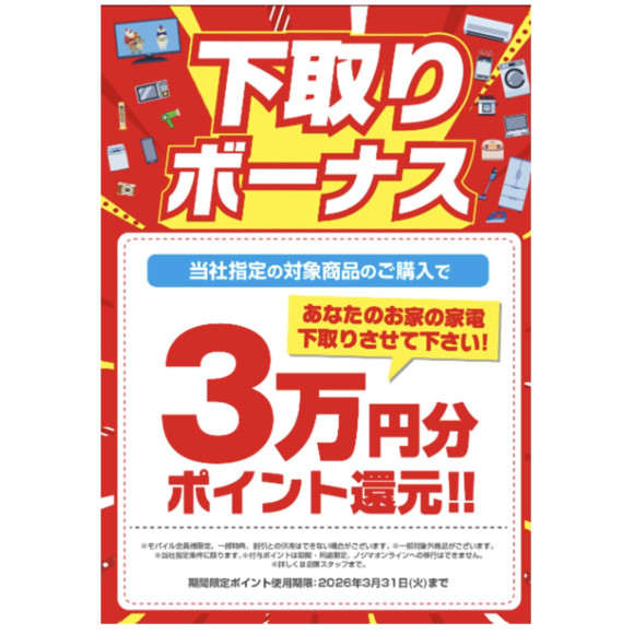 今年1年の締めくくりとして、「今年も1年間おつ家電さまでした」と題し、家電のお買い替えで下取り最大5万円引きとなるほか、下取りのボーナス特典として最大3万円分のポイントを還元いたします!