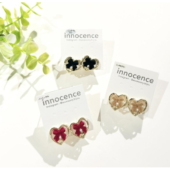 メタルのハート型の枠組みにフロッキー素材のリボンが可愛いイヤリングです✨️