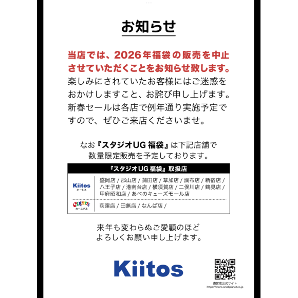 当店では、2026年福袋の販売を中止させていただきますことをお知らせいたします。