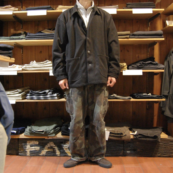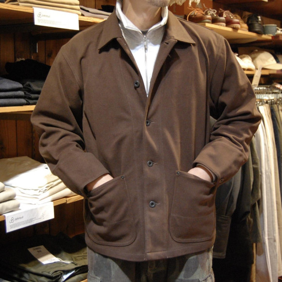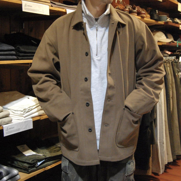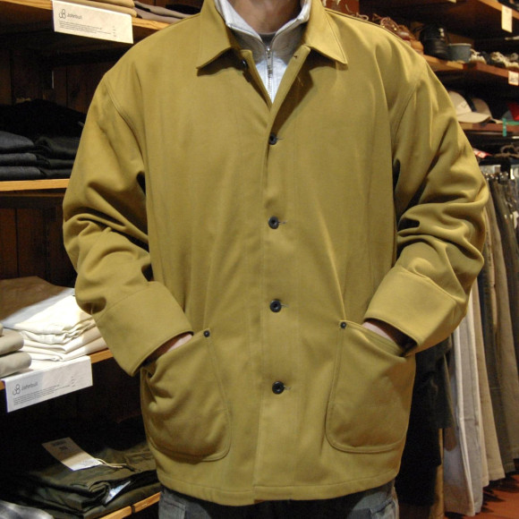 ただ、素材がトライ要素タップリ。通常のカバーオールなら、デニムやダックやモールスキン、ハズしてコーデュロイ辺りのゆくゆくは粗野なアジの出る生地感のモノが多いですが、こちらのJKTはそんな素材とは真逆なアジの無い上品な生地。