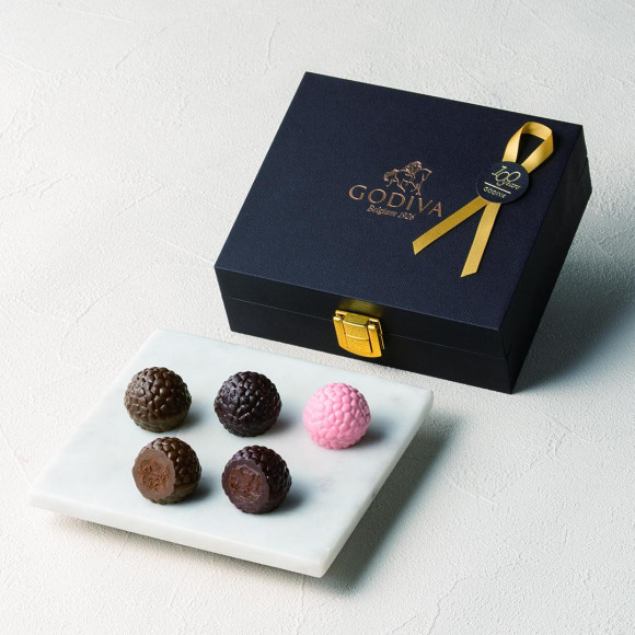 ゴディバの創立100周年を祝して、世界の舞台で活躍するスターシェフ5人がカカオへの深い敬愛を込め、それぞれの感性で創り上げた限定トリュフが誕生しました。ひと粒ごとにそれぞれのスターシェフの感性輝く、カカオの深い味わい。それらを、真っ黒な黒トリュフのようになシックな箱に詰め、特別な5粒のアソートとしてお届けします。