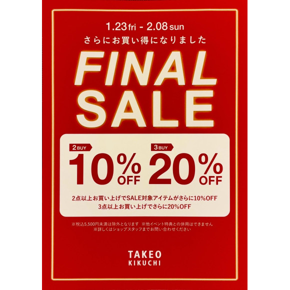 今回はタケオキクチファイナルセールキャンペーンのお知らせです!
