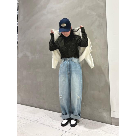深みのグリーンにダンスする女の子をプリントしたブラウス スッキリとしたシルエットのためアウトでもインでもバランスの取りやすいデザインになっています◎ 今回はあえてデニムを合わせ、上品×カジュアルのミックスしたコーディネートにしました( ◠‿◠ )✨