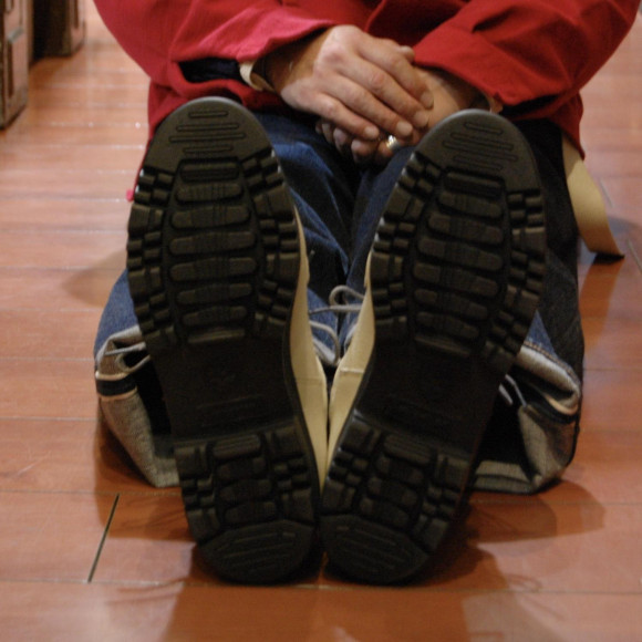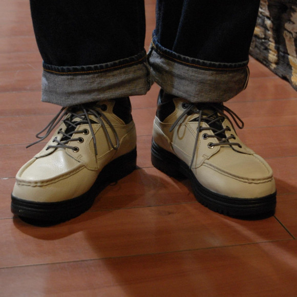 シボ革って高級なドレスシューズに使われるイメージがあったのでライトベージュの色味も合わせて、ゴツいソールとの異素材感が半端ない組み合わせは新鮮で見た目めちゃくちゃ良いですね〜