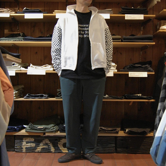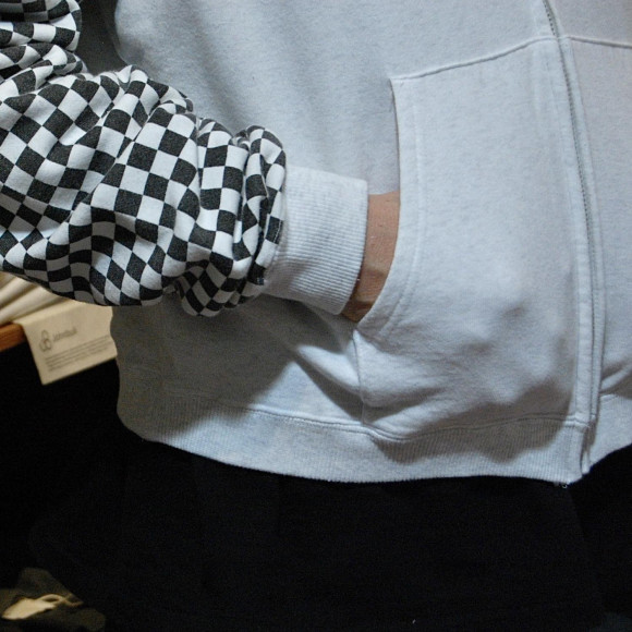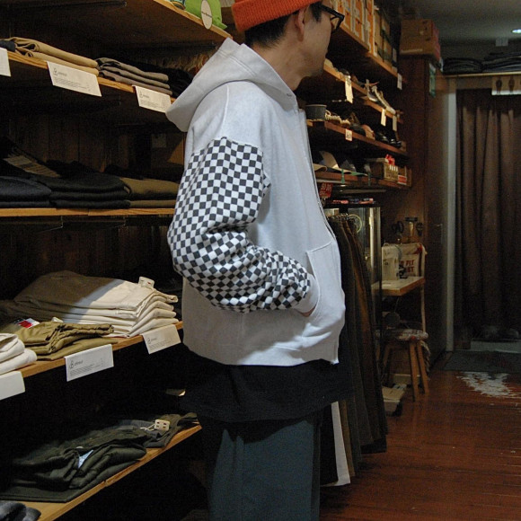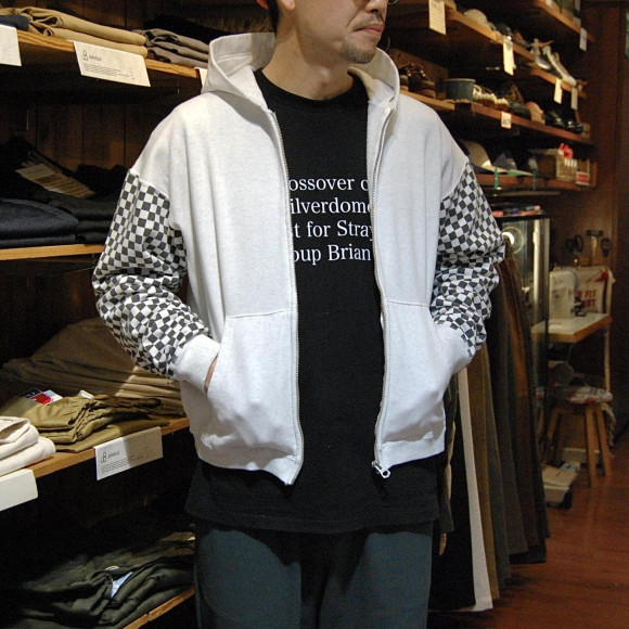 モノ的にはシンプルなZIPパーカーなのですが、デザイン的にはパンチのあるアイテムですね。無地のアッシュグレーボディに、両袖にチェッカーフラッグ柄(市松柄)がプリントされています。