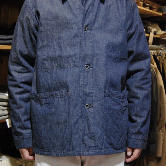 ディティールも面白く!フロント下部にジャケットの裾に巻き込む形で補強された大きめのポケットが2つ、ポケット口にはリベットが打ち込まれています。でも、胸のポケットは片側のみの内ポケットとフランスのカバーオールな匂いもさせつつポケットの数を減らす事で大戦的な要素も…