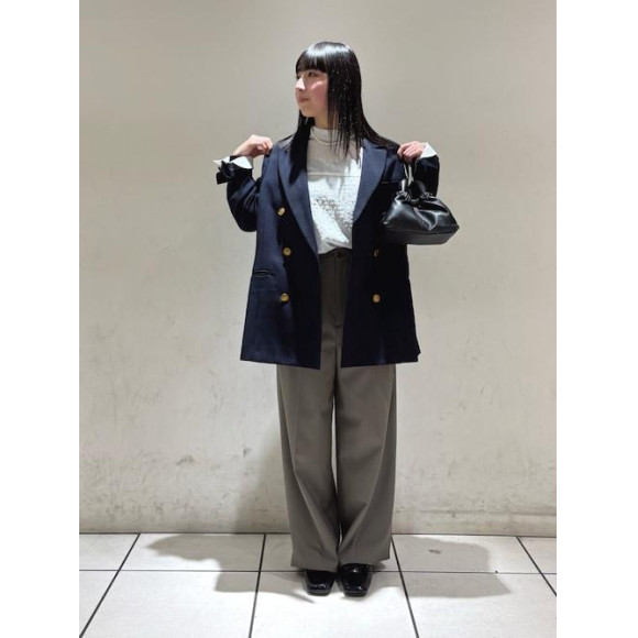 ほんのり透け感があるブラウスに、しなやかに揺れるタックワイドパンツを合わせ上品なスタイル。