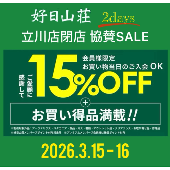 【2日間限定開催】3/15・16 立川店閉店 協賛SALE!全品15%OFF!!