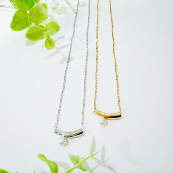 メタルのバーに小さめのパールが着いている小ぶりのデザインは、