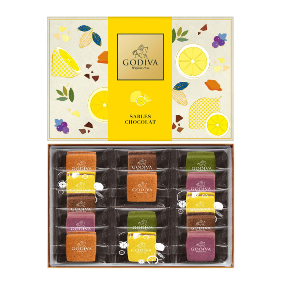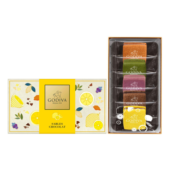 サクッと焼き上げたサブレでなめらかなチョコレートガナッシュをサンドしました。期間限定フレーバーの「瀬戸内レモン&ミルクチョコレート」と定番フレーバーの5種を限定デザインのボックスに詰め合わせました。