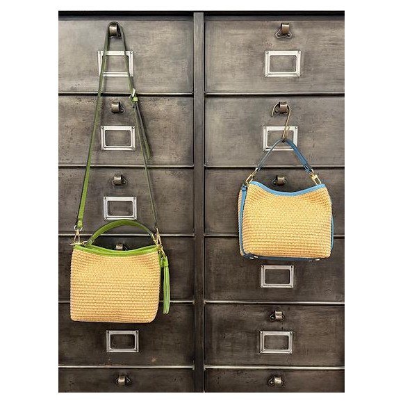 ラフィアとレザーのコンビバッグは、