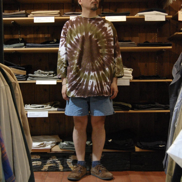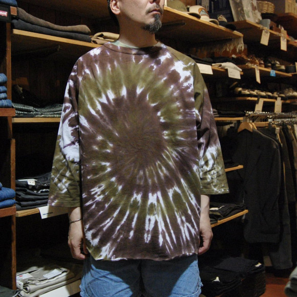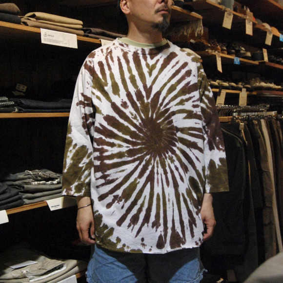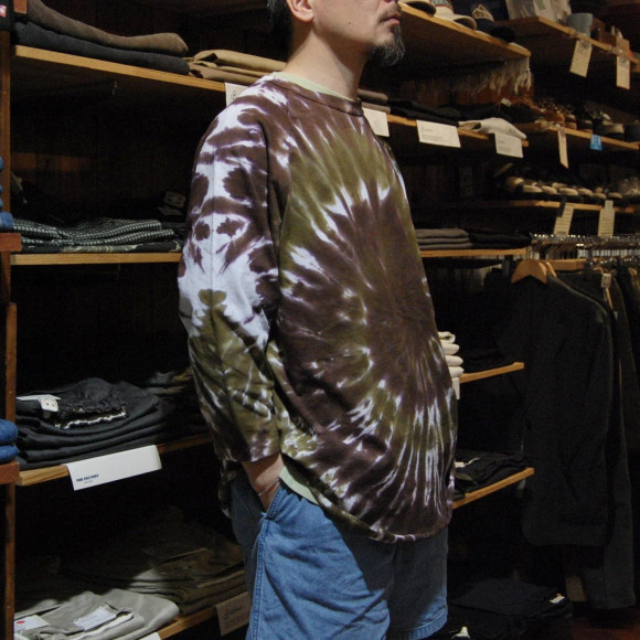 タイダイ染は自身が持つアイテムから螺旋状に生地を染めるスパイラルパターンに!これは1枚でのインパクトもそうですがインナーにした際にこの不規則な色の出方が他には無く新鮮に感じてもらえるというだろうという思惑です。